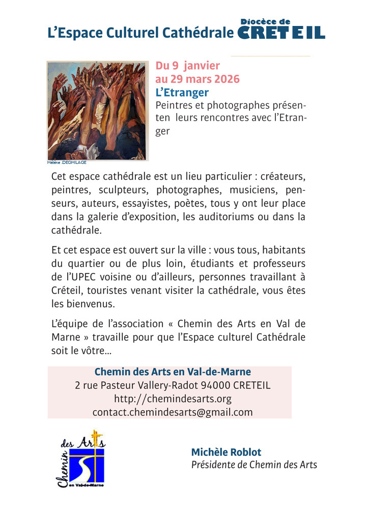 L’an 2026 commence en compagnie d’artistes plasticiens comme Hélène Deghilage, et de photographes à l’espace culturel Cathédrale de Créteil Ville de la banlieue à environ 5 km au sud-est de Paris. (Métro ligne 8 – Univ.) // The year 2026 begins in the company of visual artists like Hélène Deghilage, and photographers at the Cathédrale cultural center in Créteil, a suburban town about 5 km southeast of Paris. (Metro line 8 – Univ.)